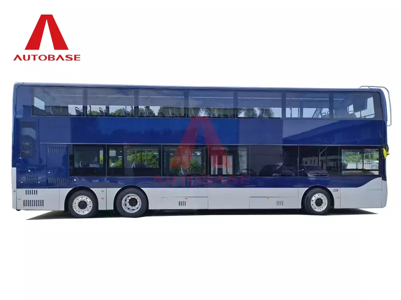 Denne 12 meter rene elektriske dobbeltdekkerbussen, designet og bygget i Kina av en ledende produsent, er produsert på en toppmoderne fabrikk og tilbys gjennom en pålitelig leverandør. Hele kjøretøyet er 12000 mm langt med lavt gulv foran og bak, en høyde på 4250 mm, en akselavstand på 5950+1500 mm, og front-/midtdører med en nettobredde på ≥1000 mm. Den har en maksimal hastighet på 90 km/t og har et setearrangement på 82+1 seter, med en total kapasitet på 98+1 passasjerer, inkludert 55 seter på øvre dekk, 27 seter på nedre dekk, 2 sammenleggbare seter og 4 prioriterte seter.