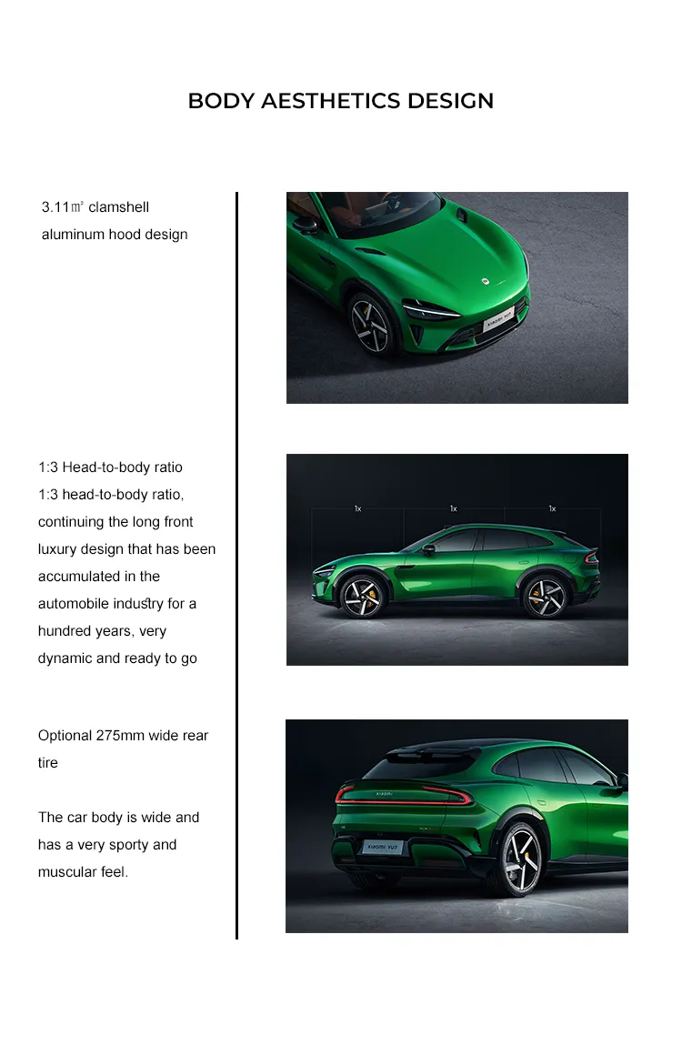 Kjøretøyet vedtar en slip-back kroppsdesign, og forsiden vedtar en lukket design med en kryssformet lysstripe. Lengden, bredden og høyden på hele bilen er 4999*1996*1608 (1600) mm, med en akselavstand på 3000 mm. Siden er utstyrt med en rammeløs dør og en skjult håndtak, som er både vakker og kan redusere vindmotstanden. Bilen vedtar et "Sky Screen Panoramic Display System" sammensatt av tre minilede skjermer. Det tre-eke rattet er utstyrt med en girskiftmekanisme, som er praktisk å betjene. Setene på bilen er dekket med Nappa Leather, den første raden er et integrert sportssete, og er utstyrt med dobbelt-tyngdekraftseter og 10-punkts massasjefunksjon. Den bakre raden støtter også 100 ° ~ 135 ° elektrisk poløs justering. I tillegg har Xiaomi Yu7 36 lagringsplasser, inkludert en bagasjerom med et volum på 141L.