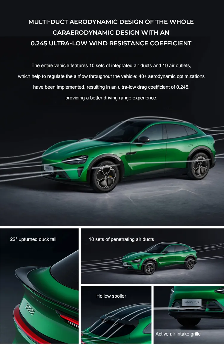 Fordelen med Xiaomi Yu7 er at den er avhengig av Xiaomis smarte hjem-økologi for å realisere den intelligente økologiske opplevelsen av "menneskelig-bil-hjem" sammenkobling og den sterke kraften som er brakt av sportsjustering. Firehjulsdriftsversjonen av høy effekt akselererer raskt og har enestående ytelse. 800V høyspenningsplattform gir utmerket ladehastighet og utholdenhet.